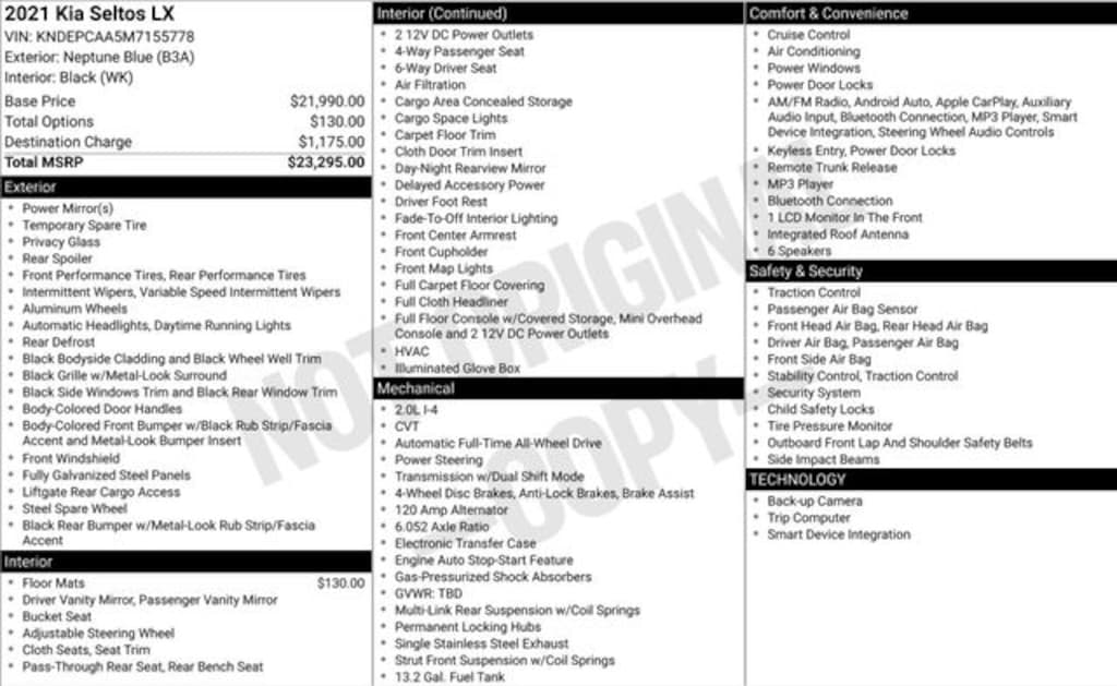 Neptune Blue 2021 Kia Seltos LX AWD CVT 2.0L I4 MPI **CLEAN VEHICLE HISTORY REPORT**, **LOCAL TRADE IN**, Alloy wheels, Bumpers: body-color, Delay-off headlights, Driver door bin, Four wheel independent suspension, Front reading lights, Illuminated entry, Occupant sensing airbag, Outside temperature display, Overhead airbag, Overhead console, Panic alarm, Passenger door bin, Speed-sensing steering, Split folding rear seat, Tachometer.